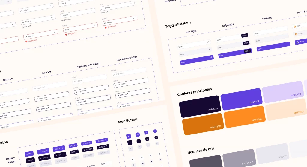 - Pour les projets complexes ou amenés à évoluer, je conçois un Design System : une bibliothèque centralisée de tous les composants graphiques et règles d’utilisation.
